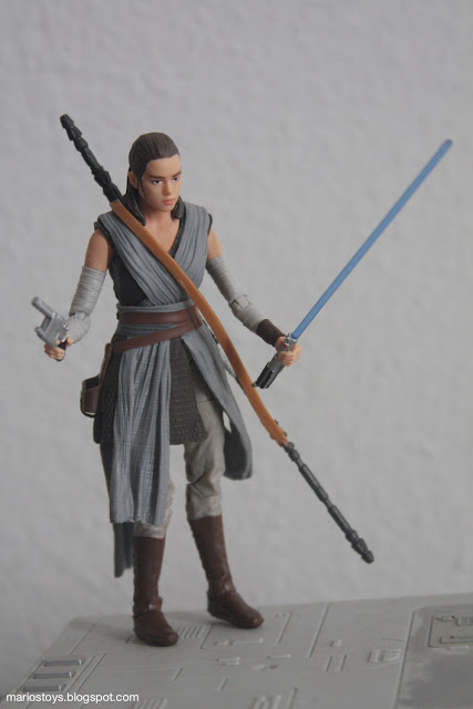 So, this is basically the Rey figure we should have had from The Force Awakens. Sure, her hair and costume are different, but she actually comes with all the accessories that make sense for her. Aside from her trusty staff, she has her lightsaber (#reyisaskywalkerconfirmed) and the blaster Han gave her (#reyisasoloconfirmed) which has a holster on her belt. The costume she's wearing is very similar (Rey loves her armwraps), but with her legs fully covered and a more grey color scheme (#greyjediconfirmed). This figure is an improvement over the previous Rey in that her face is flesh colored plastic rather than being covered in paint. Oddly, she's more tan now. Sadly, Rey does not include a porg. She has three accessories already, so it's not a complaint. Word is that Hasbro will be releasing some sort of porg release in the six inch scale later on.